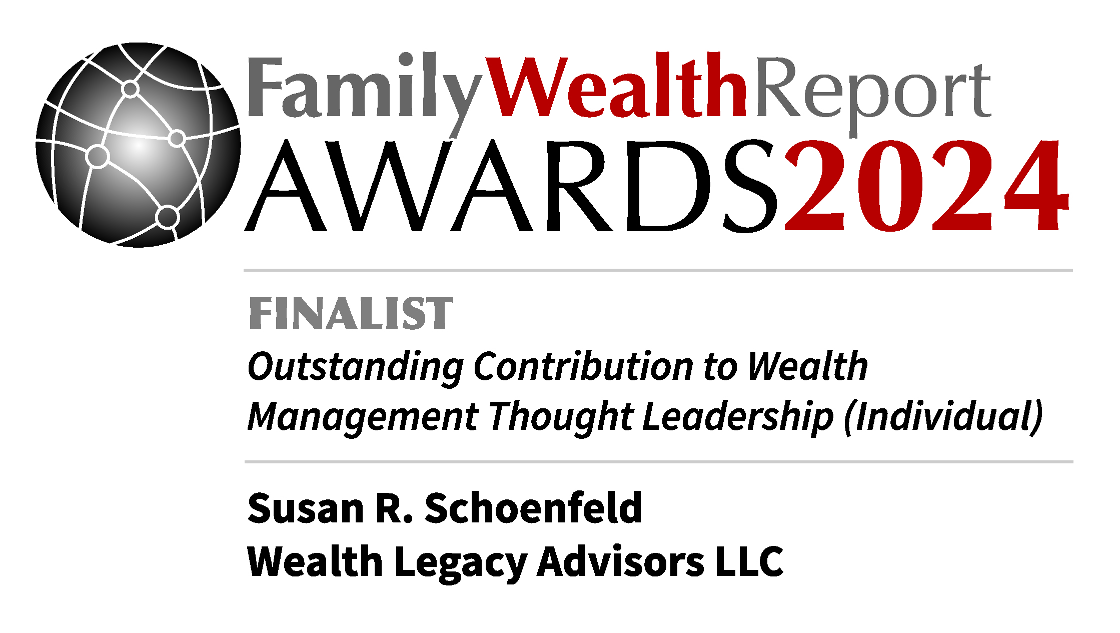 I am thrilled and surprised to have won at the Family Wealth Report Awards 2024 for Family Wealth Counseling! The awards ceremony was on May 2, 2024. The judges commented that Wealth Legacy Advisors “offers a range of services to families of significant wealth including advising on raising family members, developing leadership succession plans and legacies of family businesses. Susan R Schoenfeld is a true thought-leader in the UHNW community.” What an honor just to be included with the other exceptional finalists in this category. Congratulations to all the talented and amazing professionals and firms who were recognized.